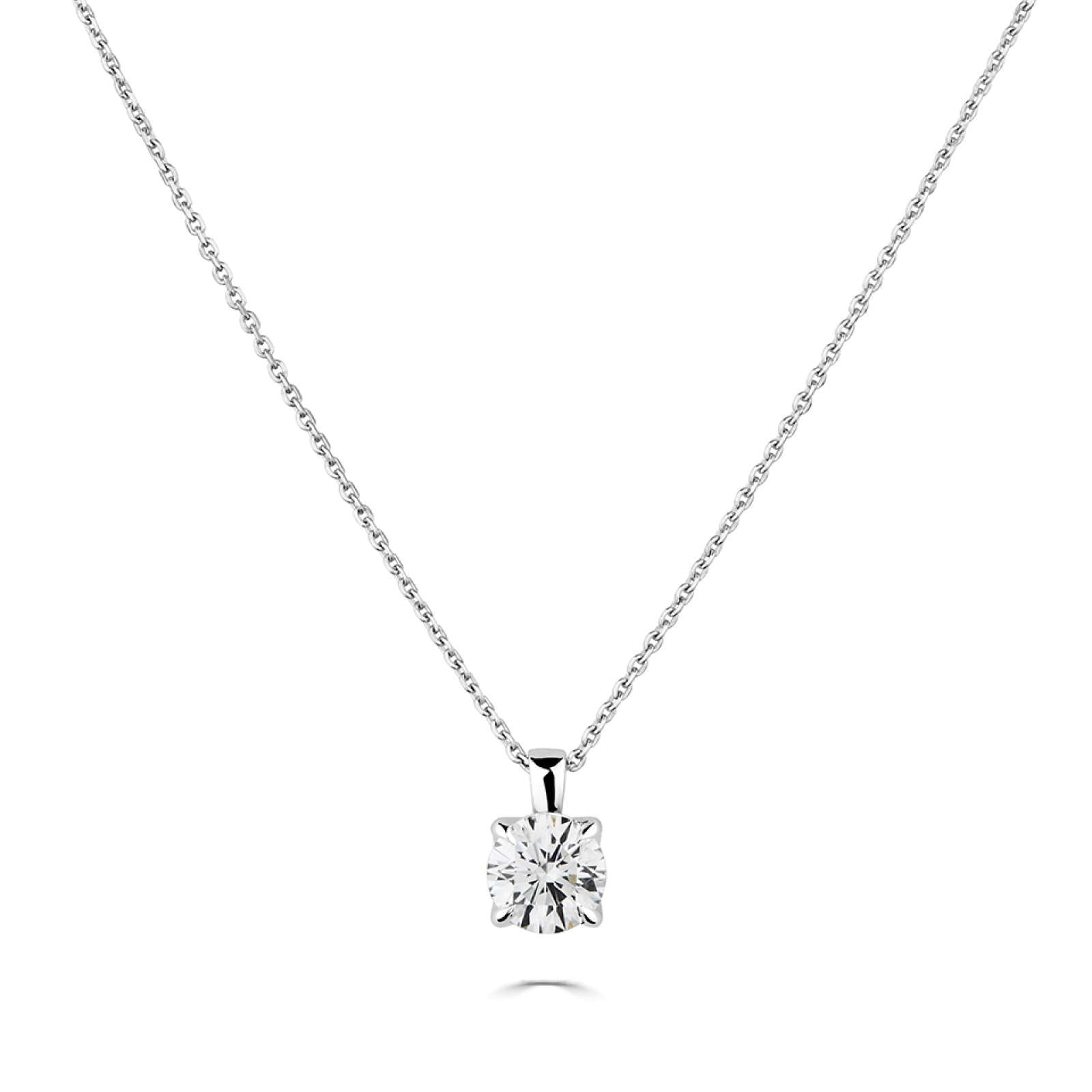 Classic 18kt white gold four claw solitaire round brilliant cut Lab Diamond pendant on an 18kt white gold 18 inch trace chain. Fully certified 'D' colour, 'Vs' clarity and 'Excellent' cut diamond. All pieces are made to order so allow approximately 2 weeks for delivery. Other sizes available on request.